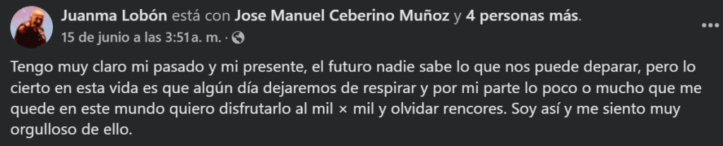 Y luego al comunicado por parte de Mägo de Oz, Juanma hizo importantes declaraciones, tanto respondiendo a la banda como en su propio perfil, en el que deja ver que se encuentra en paz habiendo dejado atrás rencores del pasado, y disfrutando la colaboración con sus antiguos compañeros.